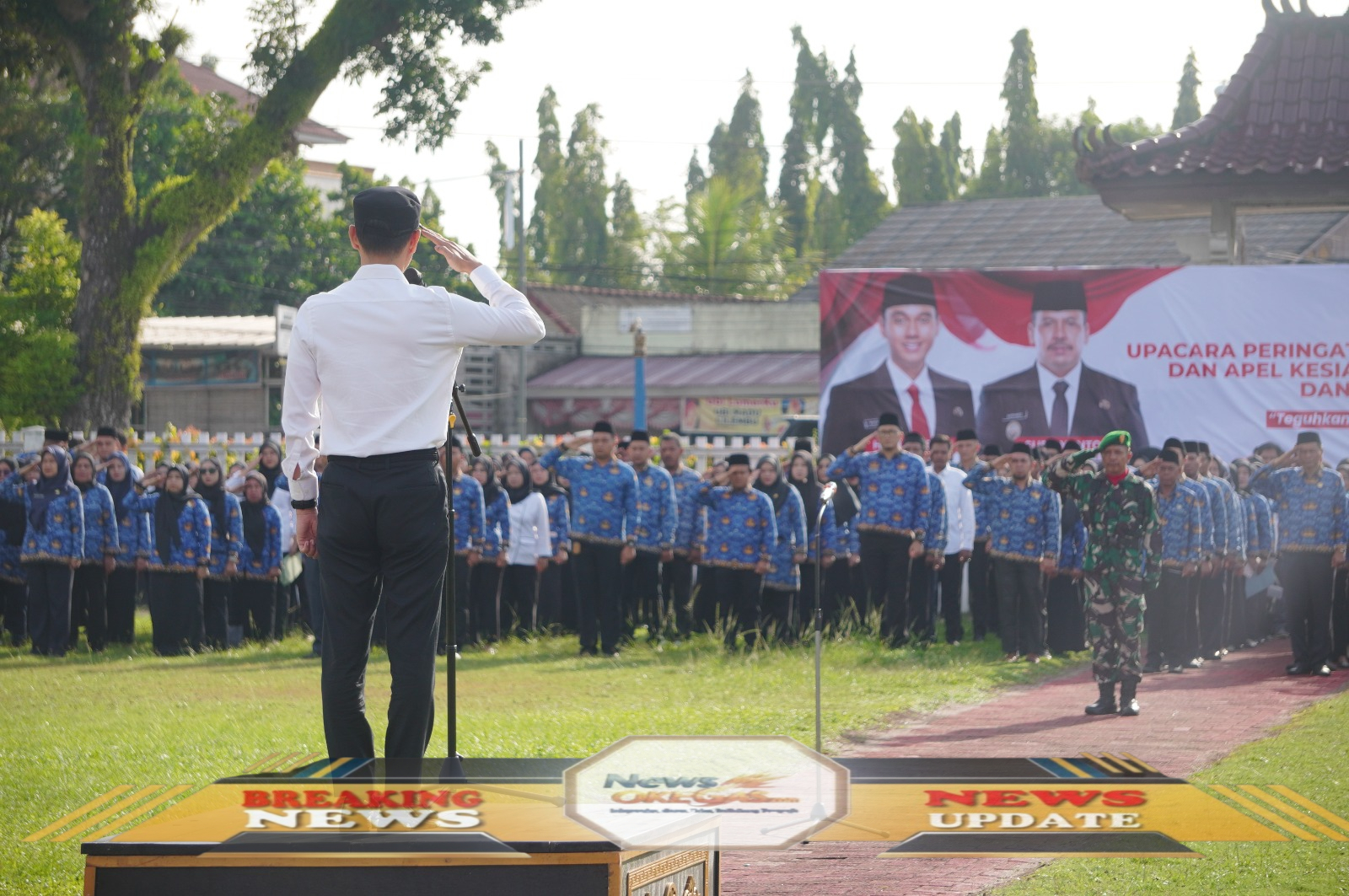 Bupati Ogan Komering Ilir (OKI) Muchendi Mahzareki memberikan hormat pada barisan ASN dan unsur terkait dalam rangka Peringatan Hari Bela Negara ke-77 Tahun 2025 sekaligus Apel Kesiapsiagaan Bencana di Halaman Kantor Bupati OKI, Rabu (17/12/2025). Acara ini mengusung semangat kebersamaan dan kesiapan menghadapi tantangan musim hujan serta berbagai potensi bencana yang mungkin terjadi./Lisin, News Oke Gas