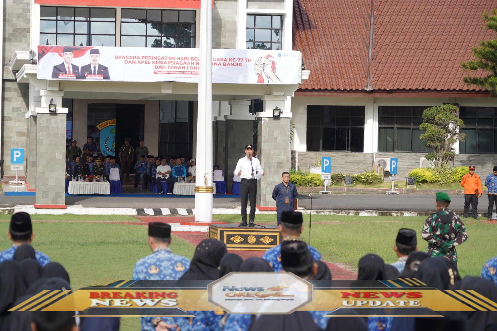Ribuan ASN Jajaran Pemerintah Kabupaten Ogan Komering Ilir (OKI) berkumpul rapi dalam rangka Apel Gabungan Bulanan, Apel Kesiapsiagaan Bencana, dan Peringatan Hari Bela Negara ke-77 Tahun 2025 di Halaman Kantor Bupati OKI pada Rabu (17/12/2025). Bupati Muchendi Mahzareki memimpin acara yang bertujuan memperkuat disiplin kerja dan kesiapan menghadapi potensi bencana musim hujan./Lisin, News Oke Gas