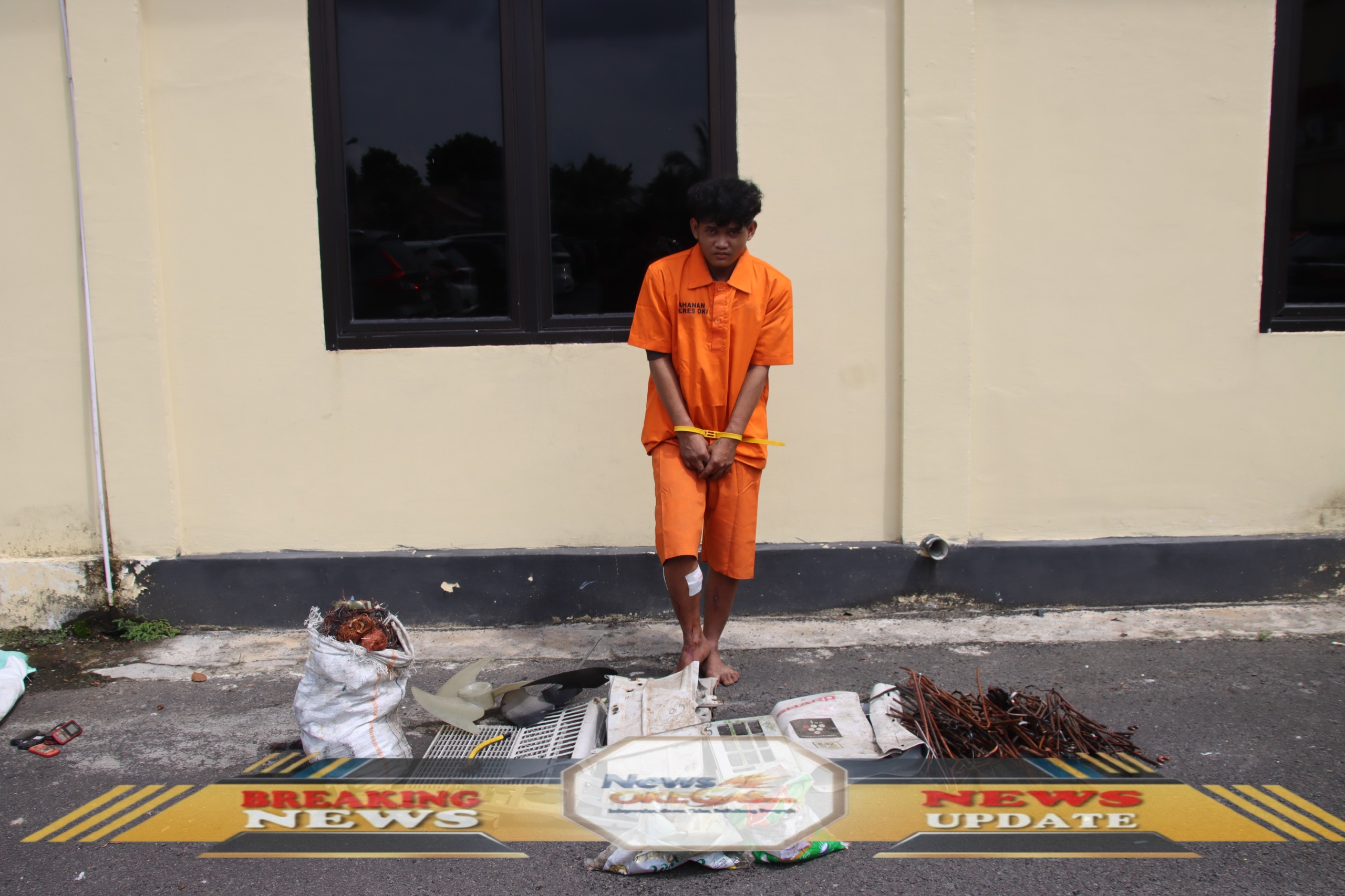 Pelaku pencurian AC berinisial AS alias Oman (20 tahun) berdiri di depan barang bukti yang diamankan Tim Gabungan Polres Ogan Komering Ilir pada Rabu (07/01/2026). Pelaku yang merupakan residivis kasus curat tahun 2021 mengaku telah beraksi di 7 lokasi TKP, dengan bukti berupa alat pemecah, sisa komponen AC, dan barang hasil curian lainnya yang diletakkan di depannya.|Lisin, News Oke Gas