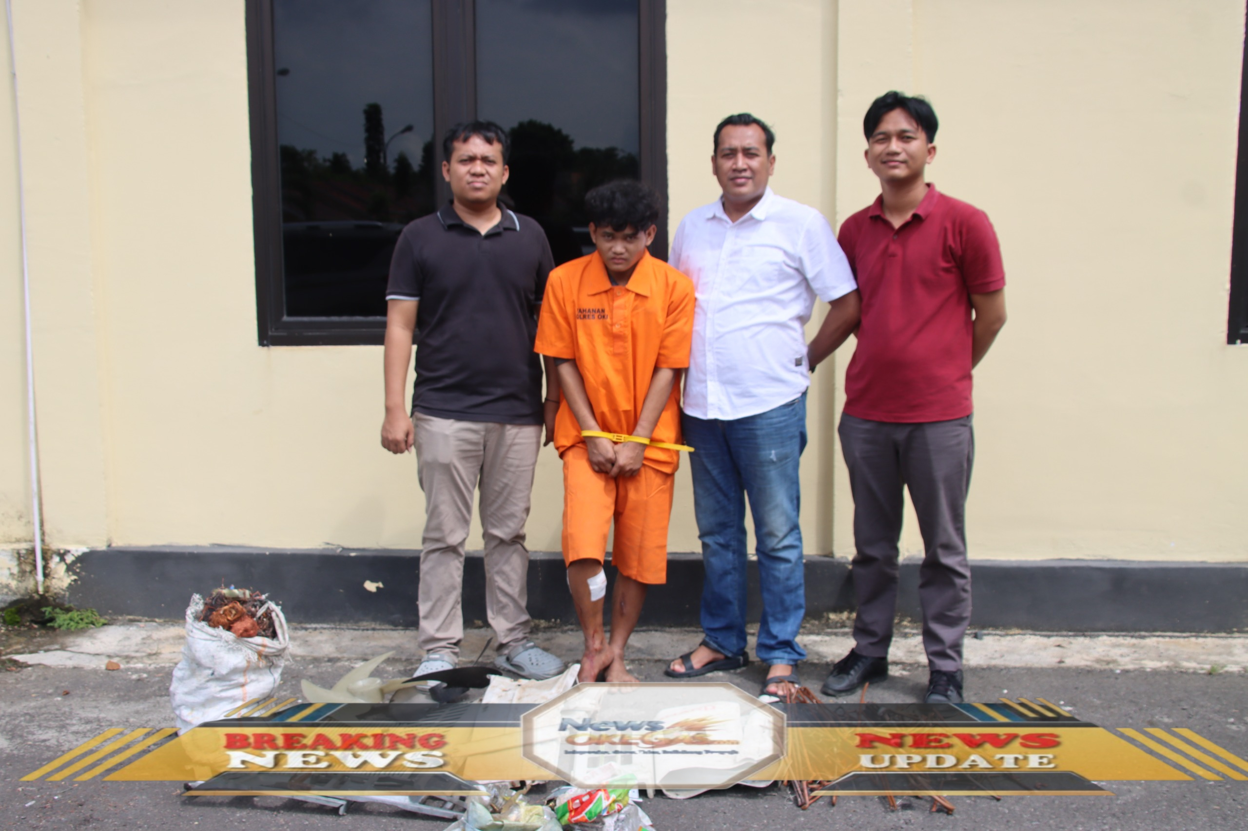 Pelaku pencurian AC berinisial AS alias Oman (berbaju oranye) bersama petugas Tim Gabungan Polres Ogan Komering Ilir pada Rabu (07/01/2026). Di depan mereka diletakkan barang bukti berupa alat pemecah, sisa komponen AC, besi baja, dan hasil curian lainnya dari 7 lokasi TKP di wilayah Kabupaten OKI. Penangkapan dilakukan tengah malam sebagai bentuk komitmen Polres OKI dalam menindak tegas pelaku kejahatan.|Lisin, News Oke Gas