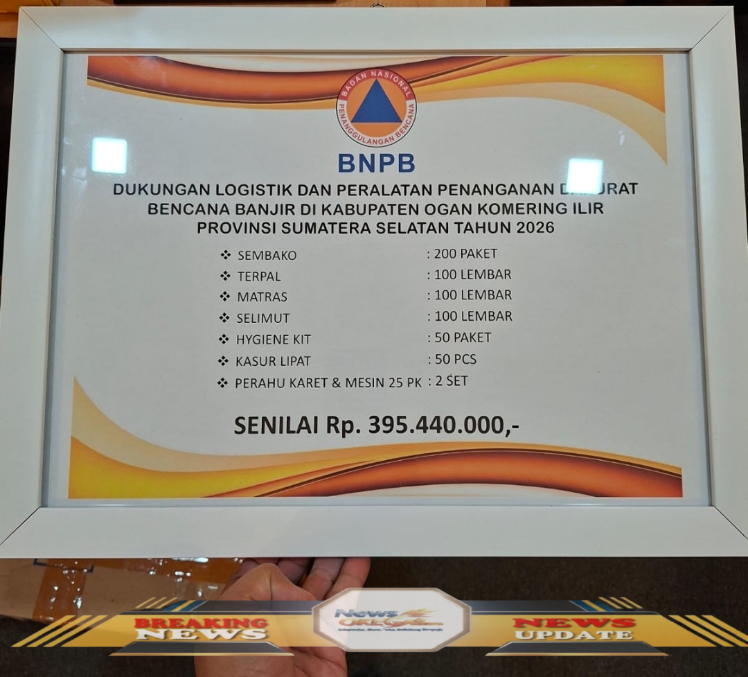 Badan Nasional Penanggulangan Bencana (BNPB) memberikan dukungan logistik dan peralatan penanganan darurat untuk mengatasi banjir di Kabupaten Ogan Komering Ilir (OKI) Provinsi Sumatera Selatan tahun 2026. Bantuan senilai Rp395.440.000 mencakup 200 paket sembako, 100 lembar terpal, 100 lembar matras, 100 lembar selimut, 50 paket hygiene kit, 50 unit kasur lipat, serta 2 set perahu karet dan mesin 25 PK – wujud nyata dukungan negara bagi masyarakat terdampak.|Lisin, News Oke Gas