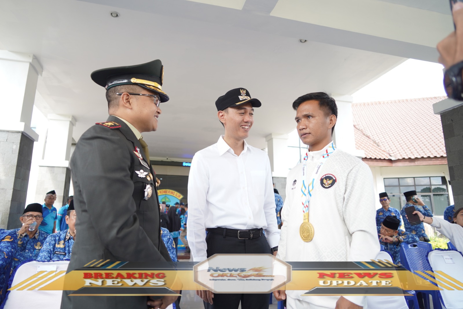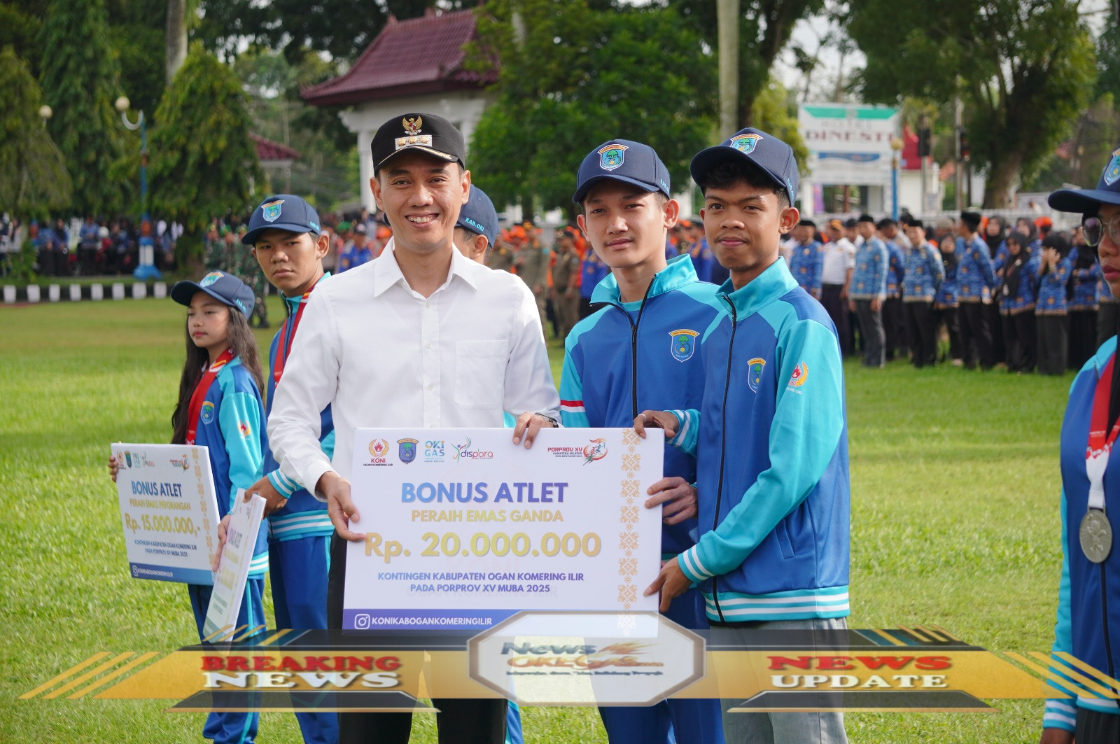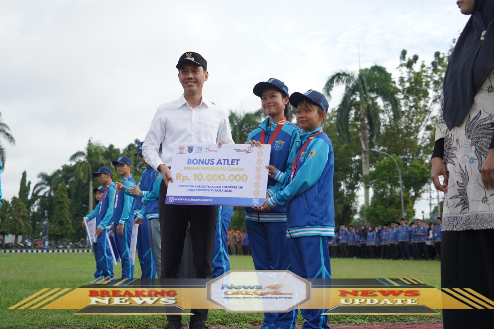 Penyerahan simbolis bonus dilakukan Bupati OKI, Muchendi Mahzareki, pada ajang Apel Bulanan Gabungan, Apel Kesiapsiagaan Bencana, dan Peringatan Hari Bela Negara ke-77, Rabu (17/12/2025).
