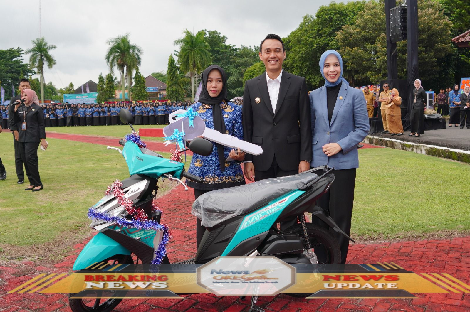 Bupati OKI H. Muchendi Mahzareki, S.E., M.Si., didampingi Ketua TP PKK dan Dekranasda Kabupaten OKI, Ny. Hj. Ike Meilina Muchendi, S.E., M.Si., menyerahkan hadiah sepeda motor kepada Nurmala Dewi, sebagai bentuk apresiasi atas dedikasinya menjadi tenaga honorer.|Lisin, News Oke Gas