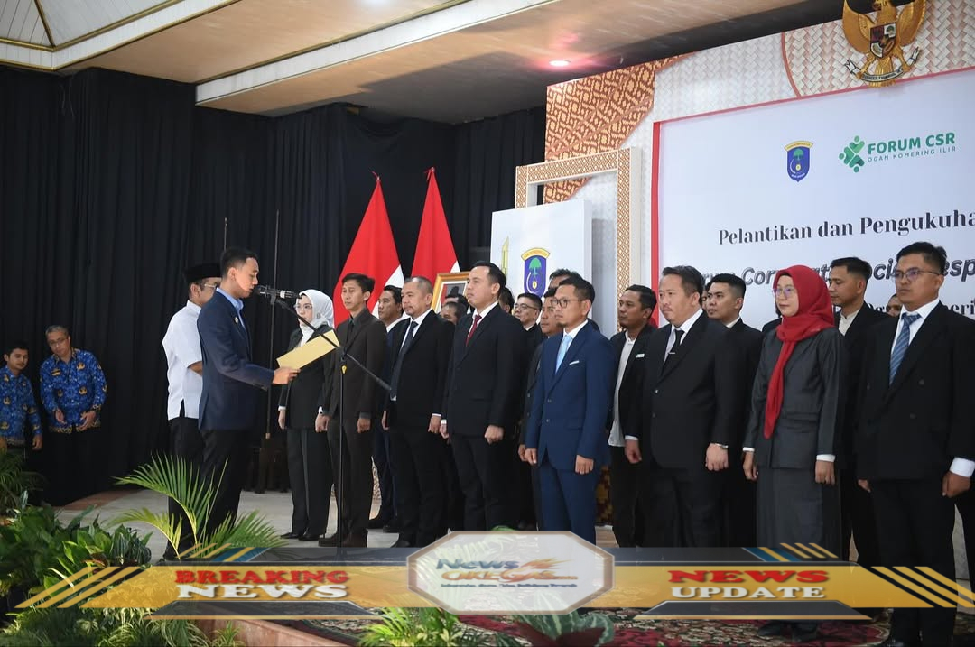 Resmi dilantik! Bupati OKI H. Muchendi Mahzareki memimpin prosesi pelantikan Marhaili Sutomo sebagai Ketua Forum CSR Kabupaten OKI periode 2025-2030 di Pendopo Kabupaten OKI, Rabu (17/9/2025)./Lisin, www.newsokegas.com