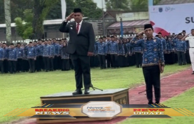 Wakil Bupati OKI, Supriyanto, SH, dan jajaran memberikan penghormatan dalam upacara peringatan Sumpah Pemuda di halaman kantor Bupati OKI, Senin, 28 Oktober 2025. Semangat Sumpah Pemuda terus berkobar dalam jiwa!/Lisin, www.newsokegas.com