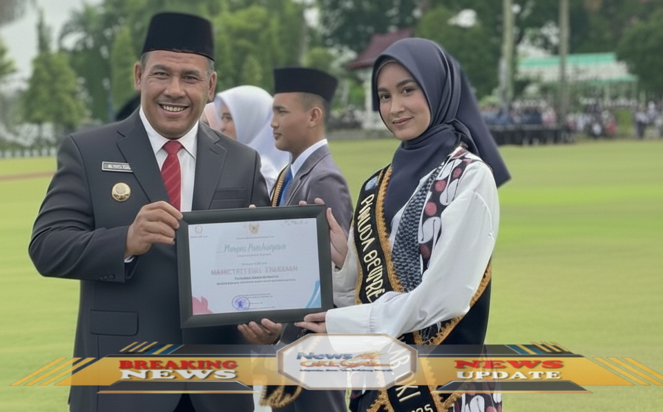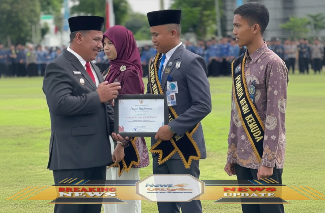 Wakil Bupati OKI, Supriyanto, SH, didampingi seorang tokoh wanita, memberikan penghargaan kepada pemuda-pemudi berprestasi dalam upacara peringatan Sumpah Pemuda di halaman kantor Bupati OKI, Senin, 28 Oktober 2025. Semangat Sumpah Pemuda, semangat membangun bangsa!/Lisin, www.newsokegas.com