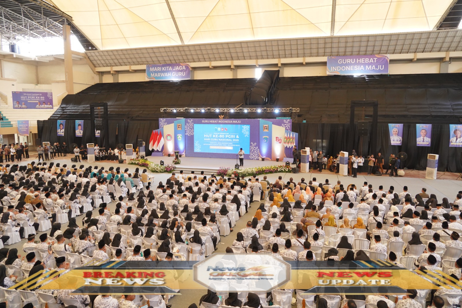 Ribuan guru dari seluruh Sumatera Selatan memadati GOR Biduk Kajang, Kayuagung, dalam puncak peringatan HUT ke-80 PGRI dan Hari Guru Nasional. Ogan Komering Ilir (OKI) menjadi tuan rumah perhelatan akbar ini, menegaskan komitmen bersama untuk memajukan pendidikan dan mensejahterakan guru di Bumi Sriwijaya./Lisin, www.newsokegas.com