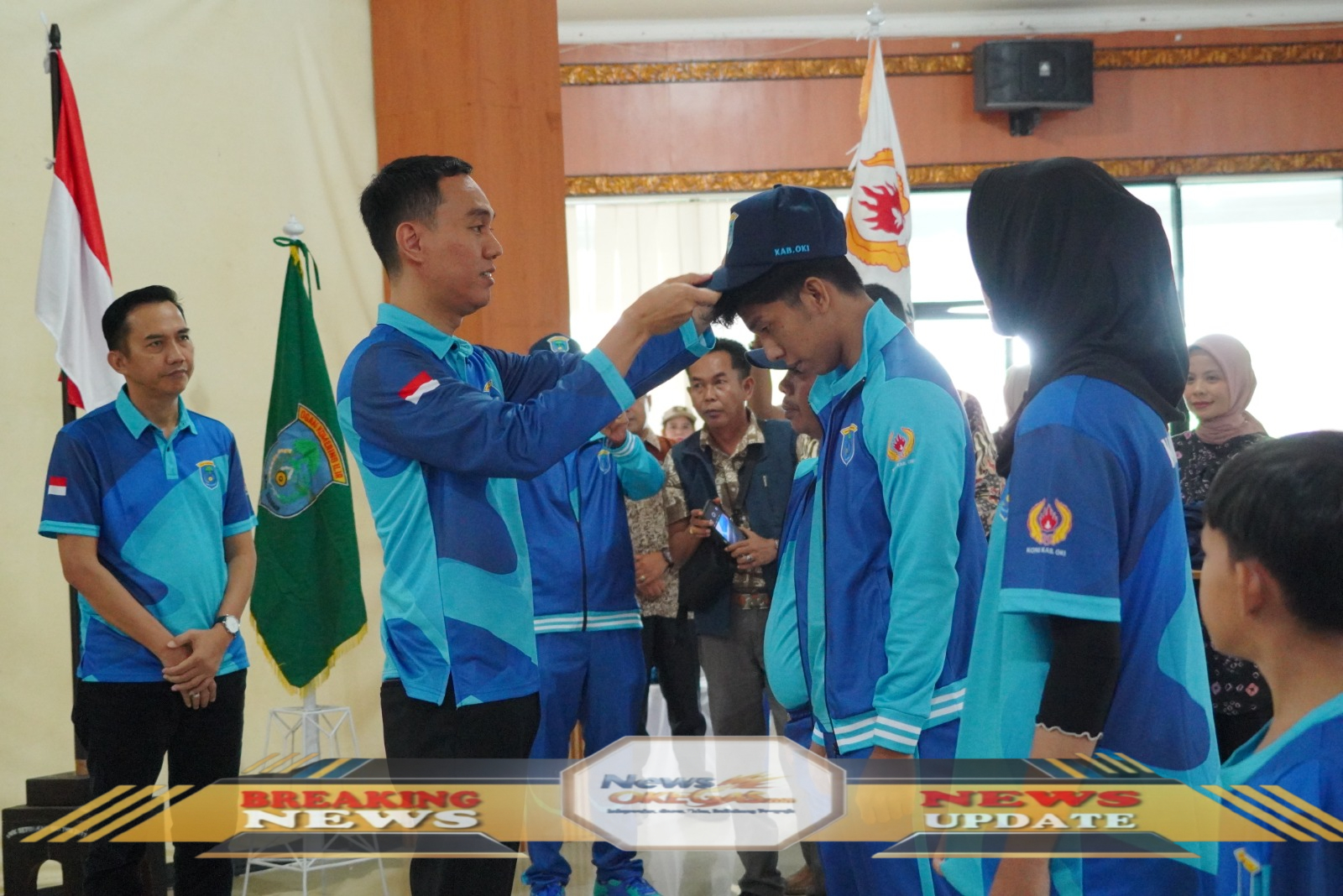 Bupati OKI, H. Muchendi Mahzareki, S.E., M.Si., menyematkan topi secara simbolis kepada salah satu atlet, menandai pelepasan ratusan kontingen Kabupaten OKI yang siap berlaga di Porprov Sumsel XV, Musi Banyuasin, 18-31 Oktober 2025. Semangat juang membara!/Lisin, www.newsokegas.com