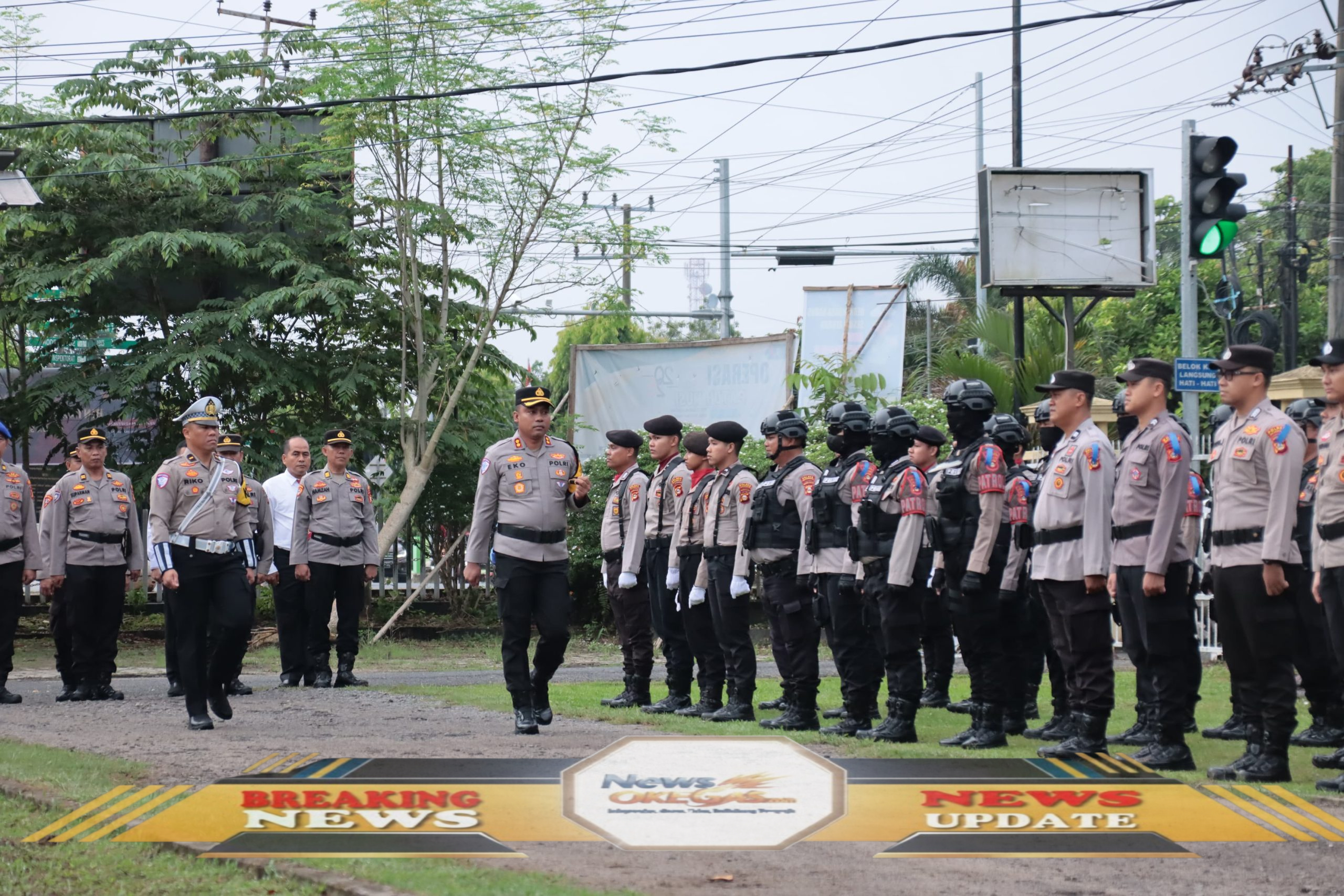 Kapolres OKI, AKBP Eko Rubiyanto, S.H., S.I.K., M.H., saat memimpin pengecekan pasukan gabungan dalam Apel Gelar Pasukan Operasi Zebra Musi 2025 di Mapolsek Kayuagung, Senin (17/11/2025)./Lisin, www.newsokegas.com
