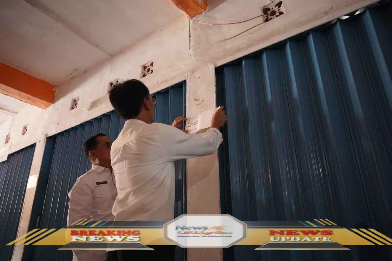 Petugas dari Pemkab OKI menempelkan stiker peringatan pada kios yang menunggak retribusi di Pasar Rakyat Kayuagung, disaksikan oleh Sekda OKI, Ir. H. Asmar Wijaya, dan jajaran terkait, Rabu (3/12/2025)./Lisin, www.newsokegas.com