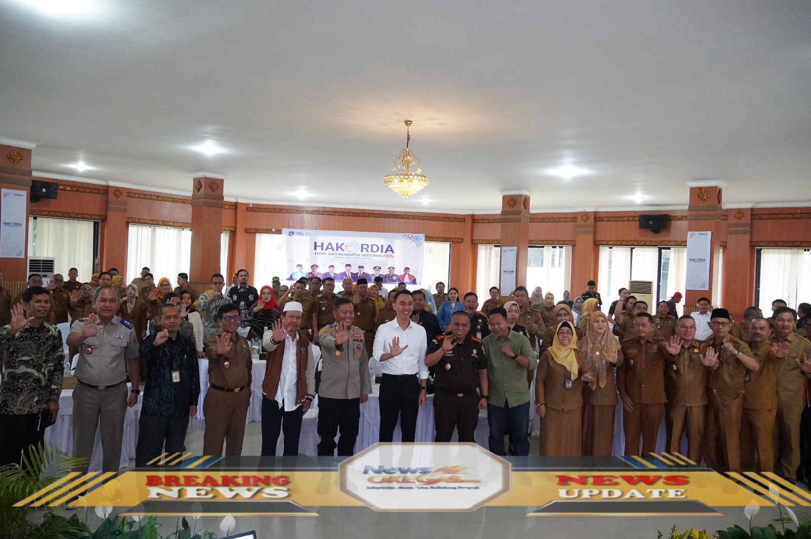 Ribuan peserta dari berbagai elemen pemerintah dan masyarakat Kabupaten Ogan Komering Ilir (OKI) berfoto bersama pada acara Puncak Hakordia di Ruang Rapat Bende Seguguk II Kantor Bupati OKI, Selasa (9/12/2025). Acara yang menampilkan backdrop tema “Hakordia Hari Anti Korupsi Sedunia 2025” menjadi momentum untuk menguatkan komitmen bersama dalam meningkatkan capaian Monitoring Centre for Prevention (MCP) hingga 81.5, menjadikan OKI peringkat kedua tertinggi di Sumatera Selatan dan peringkat 85 secara nasional. Semua peserta menunjukkan komitmen melalui tanda tangan bersama untuk mendukung upaya membangun pemerintahan yang transparan, akuntabel, dan bebas dari korupsi./Lisin, www.newsokegas.com