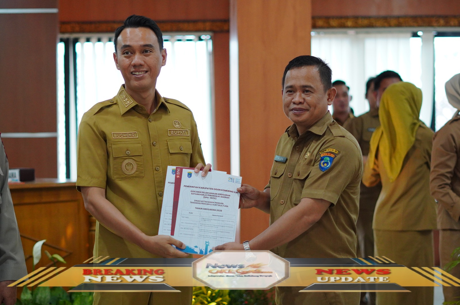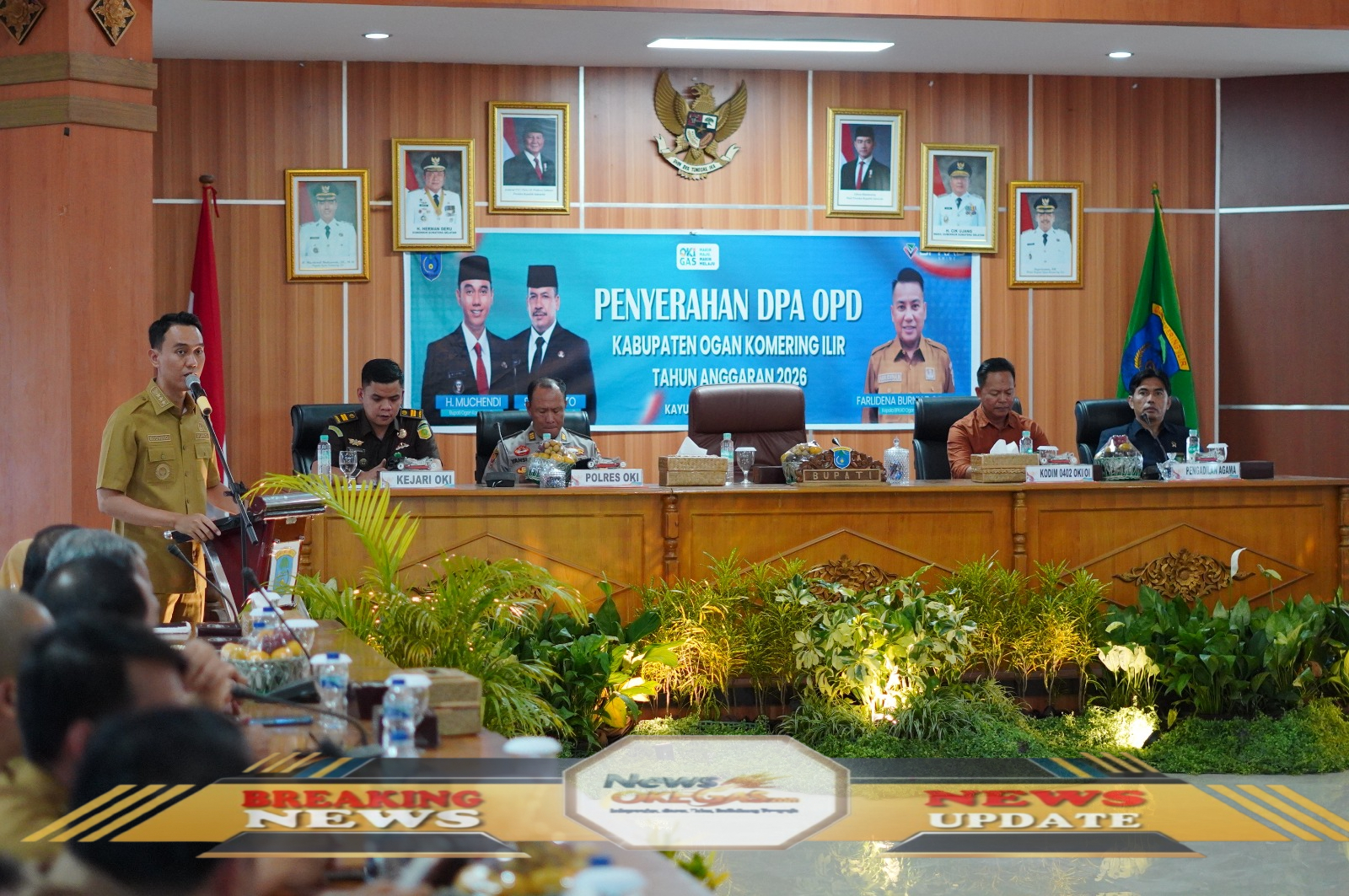 Kabupaten Ogan Komering Ilir (OKI), Selasa (13/1/2026) – Bupati OKI H. Muchendi Mahzareki, SE., M.Si. secara langsung menyerahkan Dokumen Pelaksanaan Anggaran (DPA) kepada salah satu perwakilan Organisasi Perangkat Daerah (OPD). DPA tahun anggaran 2026 senilai Rp2,214 triliun menjadi dasar untuk pelaksanaan program prioritas pendidikan, kesehatan, dan infrastruktur yang tepat sasaran bagi masyarakat OKI.|Lisin, News Oke Gas