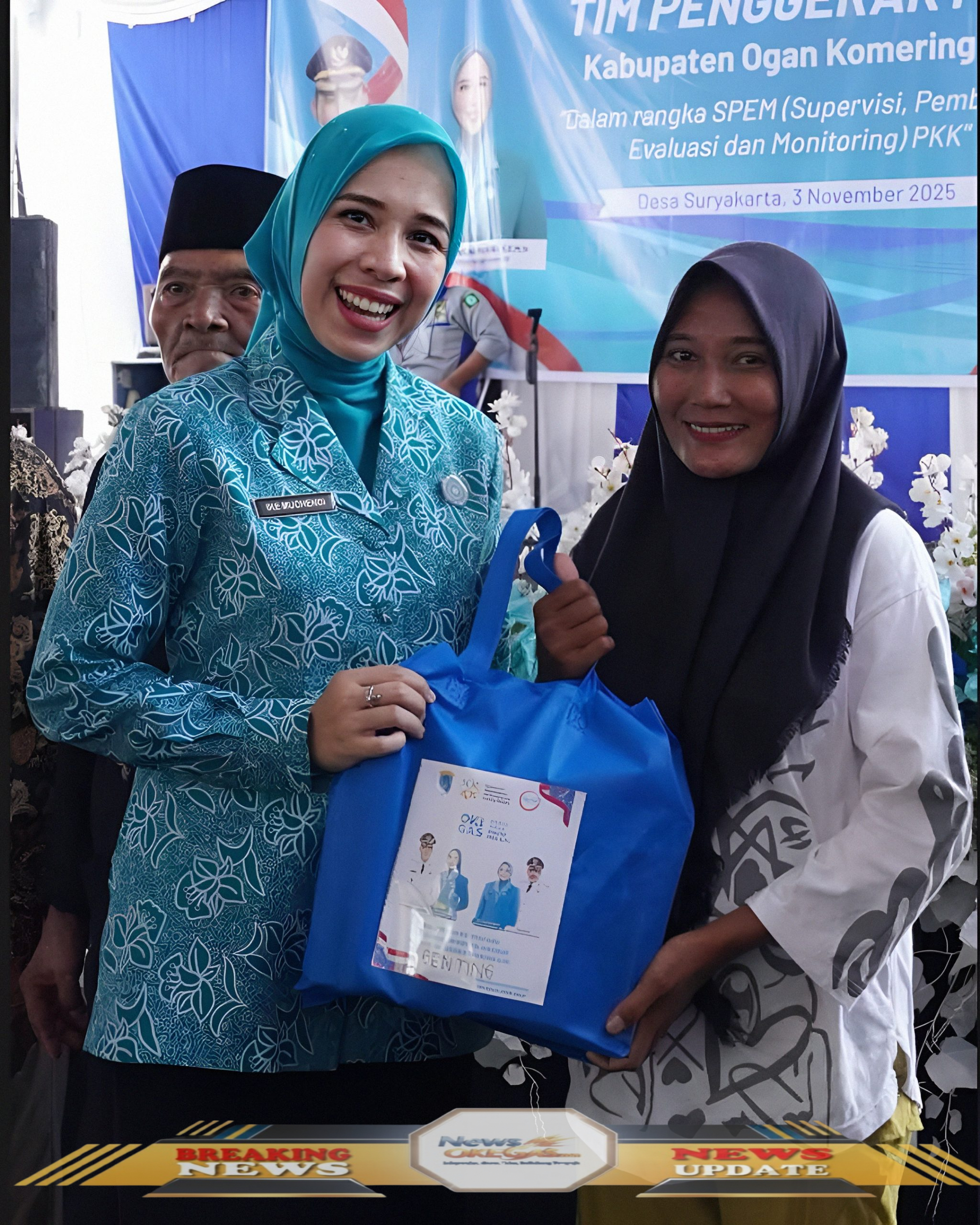 Ketua TP PKK OKI, Hj. Ike Muchendi, menyerahkan bantuan kepada warga Desa Surakarta dalam rangka kegiatan SPEM (Supervisi, Pembinaan, Evaluasi, dan Monitoring) PKK. Semoga bantuan ini bermanfaat dan membawa berkah bagi keluarga penerima./Lisin, www.newsokegas.com