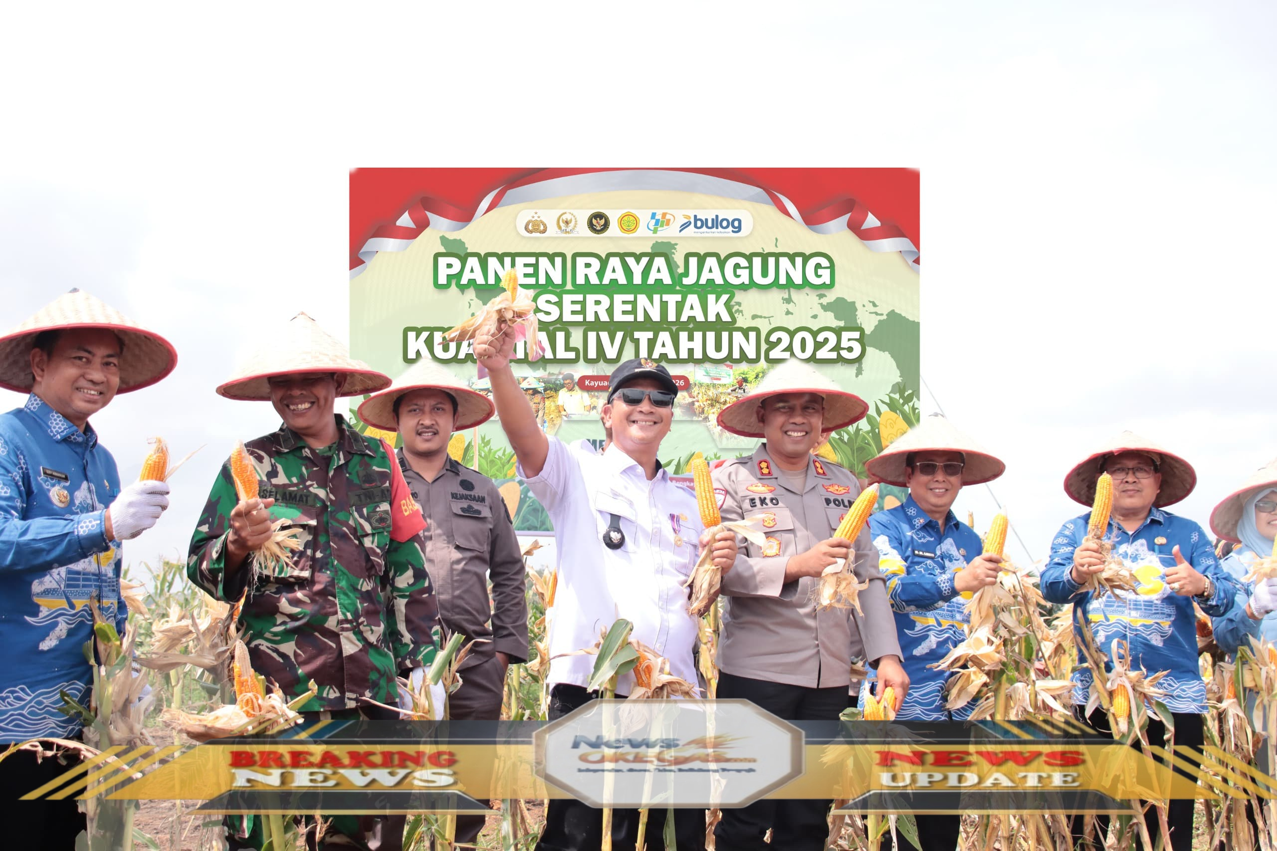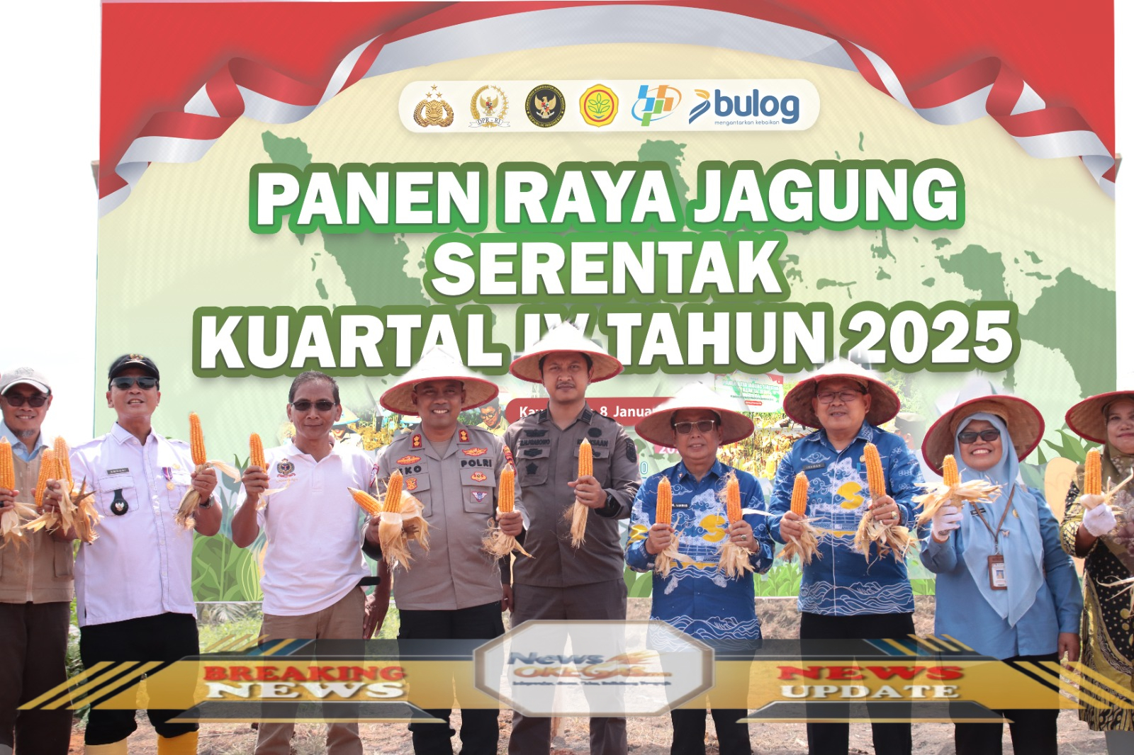 Kapolres OKI AKBP Eko Rubiyanto, S.H., S.I.K., M.H. (kedua dari kanan, seragam abu-abu) bersama unsur TNI, pemerintah daerah, dan tokoh masyarakat meriahkan hasil panen jagung di lahan milik Aiptu Abastari, Kelurahan Kutaraya. Dengan semangat kolaborasi yang tinggi, kegiatan yang juga terhubung secara nasional ini menjadi bukti nyata dukungan Polri dalam memperkuat program ketahanan pangan daerah dan negara.|Lisin, News Oke Gas