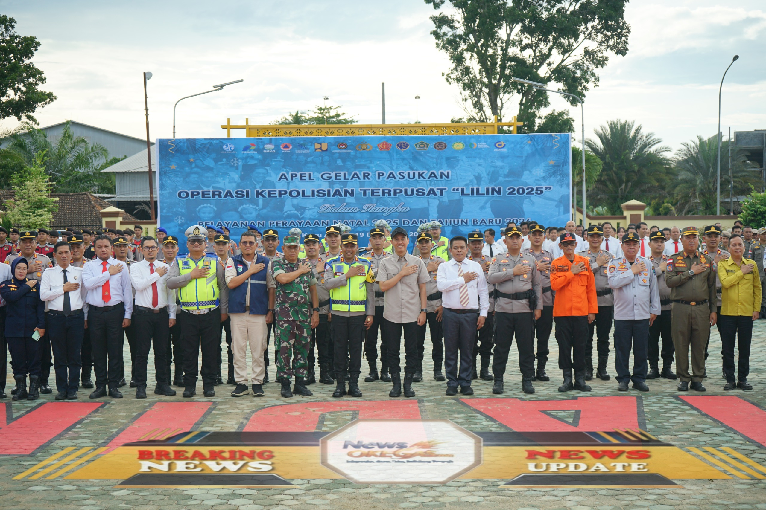 Para pimpinan dan seluruh peserta Apel Gelar Pasukan Operasi Kepolisian Terpusat ‘Lilin 2025’ memberikan hormat pada acara penutup, sebagai bukti komitmen bersama dalam melayani masyarakat dan menjamin keamanan perayaan Natal 2025 serta Tahun Baru 2026 di Kabupaten Ogan Komering Ilir./Lisin, News Oke Gas