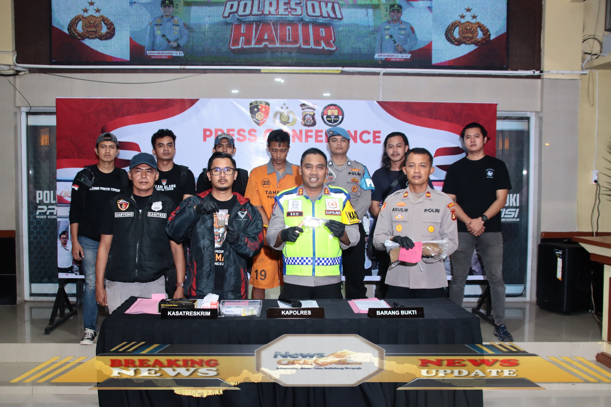 AKBP Eko Rubiyanto, SH., SIK., MH (Kapolres OKI) bersama jajaran petugas kepolisian dan pihak terkait memamerkan barang bukti dalam konferensi pers pengungkapan kasus di wilayah Kabupaten Ogan Komering Ilir. Tampilan layar dengan tulisan ‘POLRES OKI HADIR’ menjadi latar belakang, menguatkan komitmen kepolisian dalam menjaga keamanan dan menegakkan hukum untuk kesejahteraan masyarakat.|Lisin, News Oke Gas