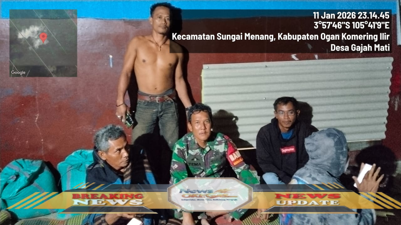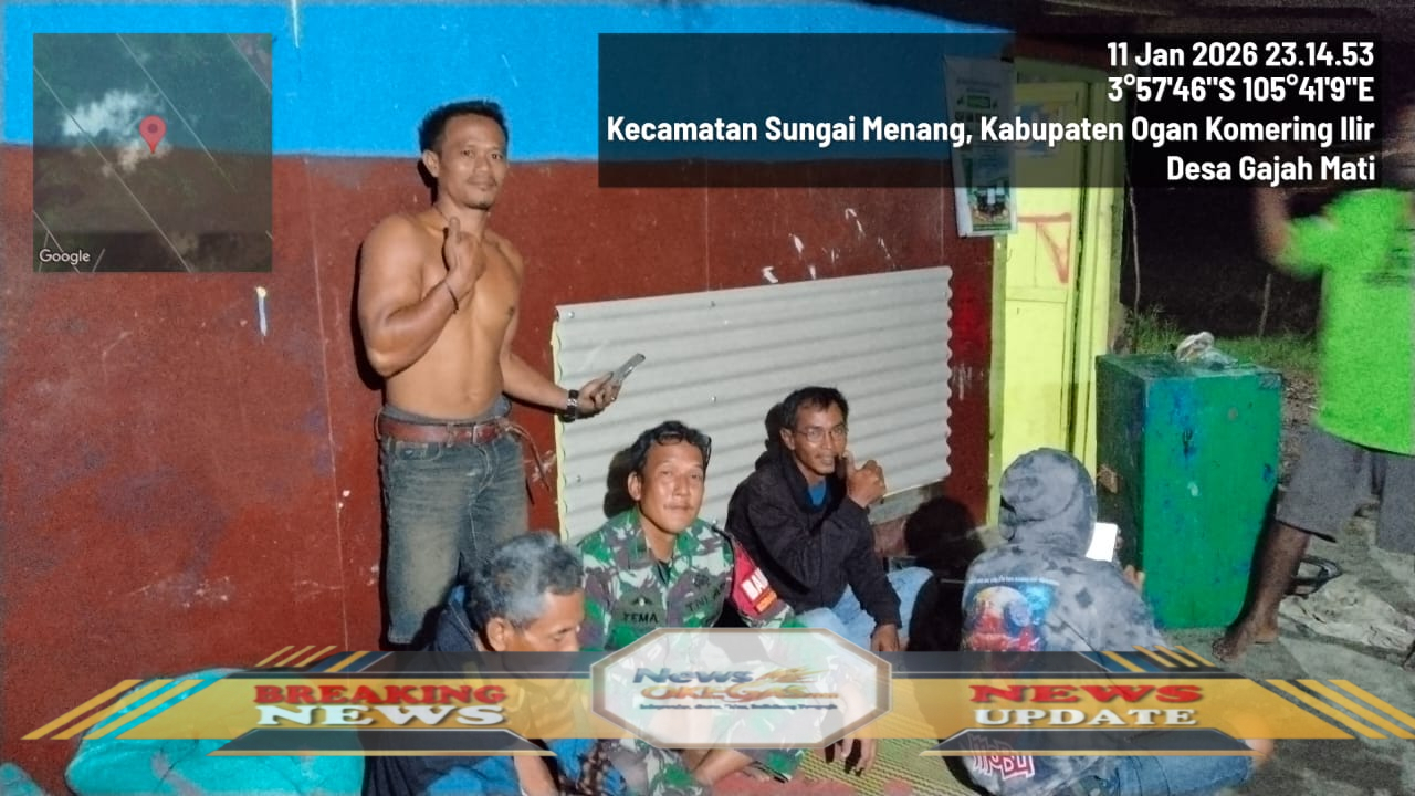 Pukul 23.14 WIB, 11 Januari 2026 (koordinat 3°57’46″S 105°41’9″E), Babinsa dan masyarakat Kecamatan Sungai Menang, Kabupaten Ogan Komering Ilir, berkumpul setelah melakukan patroli terpadu antisipasi potensi banjir. Meskipun cuaca berat, semangat kolaborasi untuk menjaga keamanan wilayah tetap tinggi, menjadi bukti komitmen bersama melindungi kesejahteraan warga.|Lisin, News Oke Gas