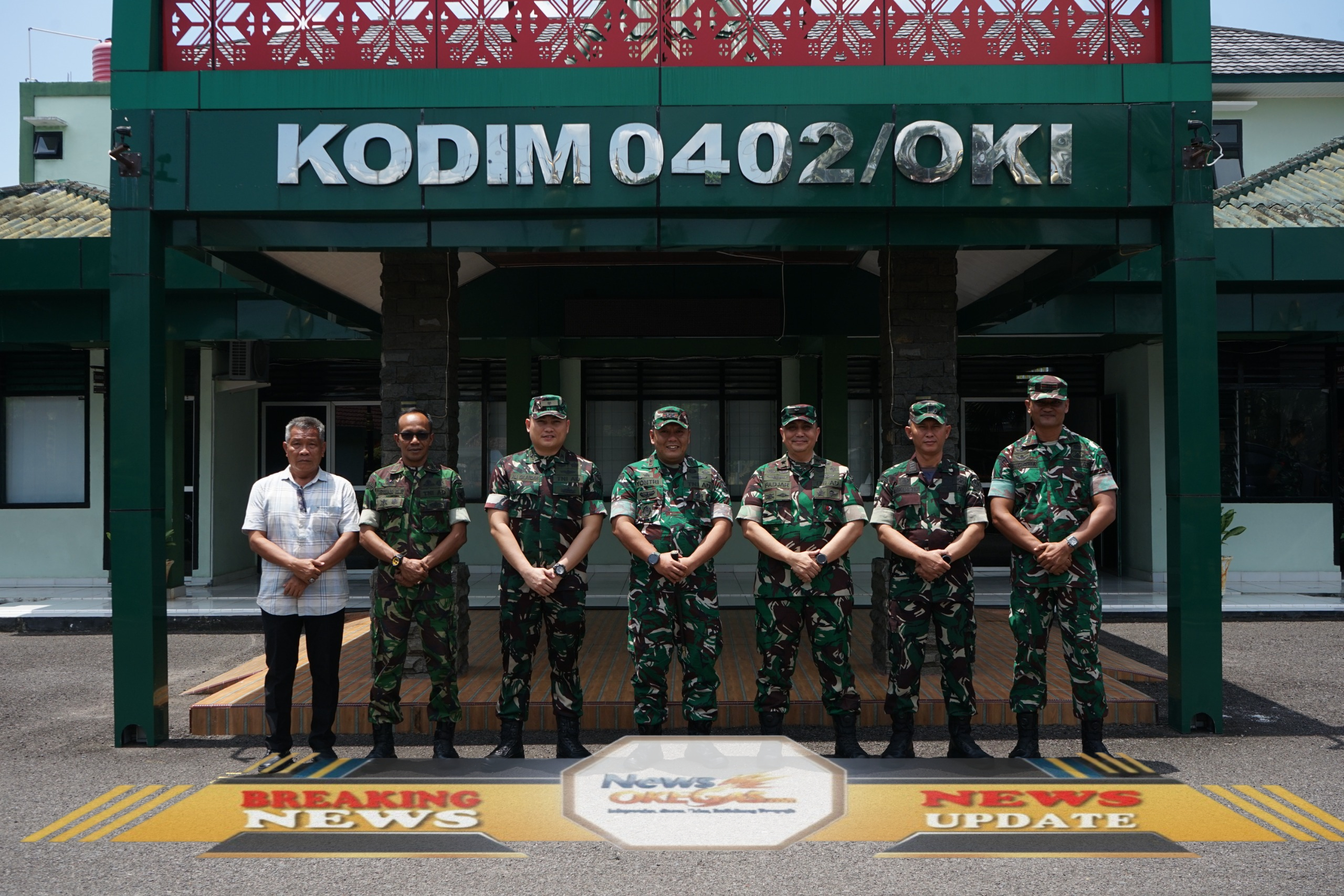 Dandim 0402/OKI-OI, Letkol Inf Yontri Bhakti, S.H., M.H., bersama Tim Pengawas dan Evaluasi (Wasev) Bakti TNI Tahun 2025, Brigjen TNI Fadjar Tjahjono, S.I.P., berfoto bersama di depan Makodim 0402/OKI-OI pada Kamis, 25 September 2025./Lisin, www.newsokegas.com