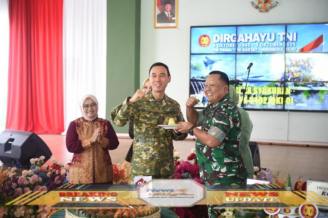 Bupati OKI, H. Muchendi Mahzareki, SE., M.Si., bersama Dandim 0402/OKI-OI, Letkol Inf Yontri Bhakti, SH., MH., dalam kemeriahan syukuran HUT TNI ke-80 di Makodim 0402/OKI-OI, Minggu (5/10/2025)./Lisin, www.newsokegas.com