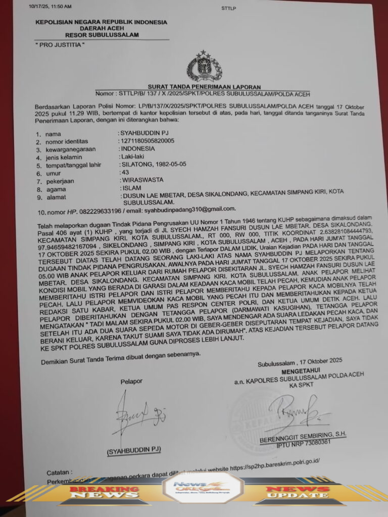 Surat Tanda Penerimaan Laporan (STTLP) kasus teror wartawan Subulussalam. Semoga keadilan segera berpihak pada korban./Humas SWI, www.newsokegas.com