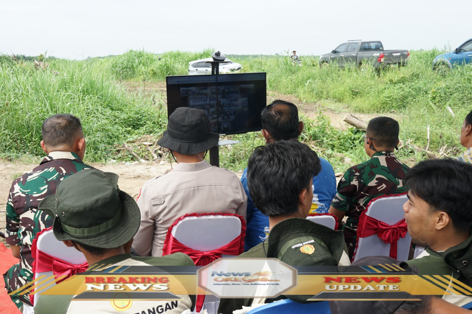 Mendengarkan Arahan: Jajaran Forkopimda dan peserta mengikuti konferensi video (vidcon) bersama Danrem 044/Gapo dalam acara Tanam Padi Perdana Program Cetak Sawah 2025 di Desa Benawa, menunjukkan kesiapan dan koordinasi dalam mendukung program ketahanan pangan./Lisin, www.newsokegas.com